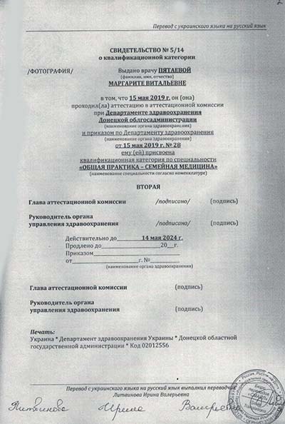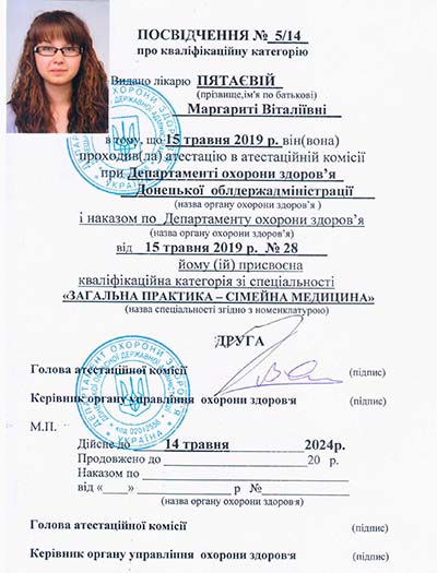 - В мае 2019 года прошла аттестацию в аттестационной комиссии при Департаменте здравоохранения Донецкой облгосадминистрации с присуждением квалификационной категории по специальности "Общая практика –семейная медицина".